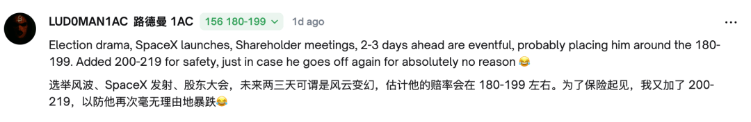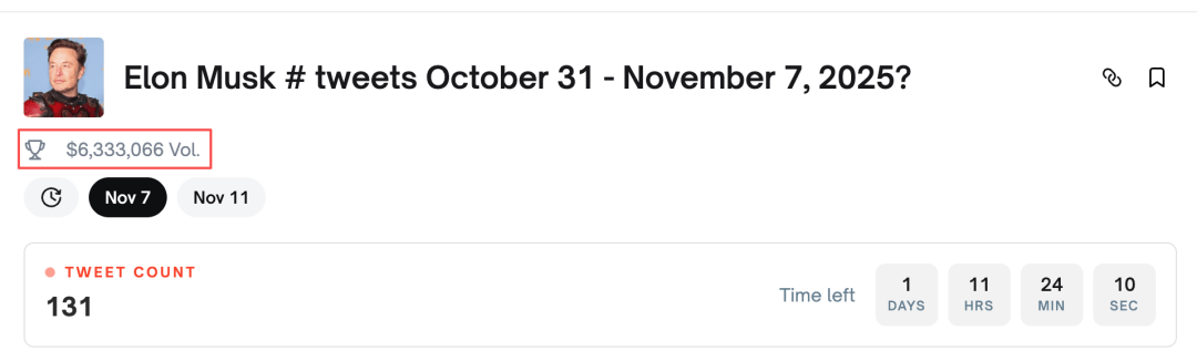 截至此刻,马斯克本周已经发了 131 条推。如果你现在去押注“120-139”这个区间,只需花 1 美元,就有可能血赚 166 美元。