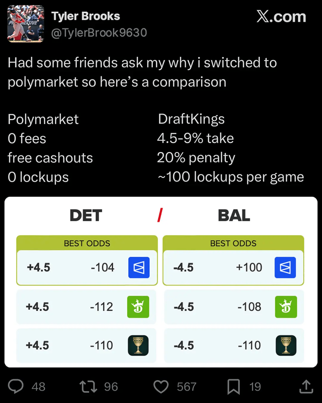 广告模拟了一位“Tyler Brooks”的用户视角,他在 X 上分享“自己为何从 DraftKings 转向 Polymarket”。