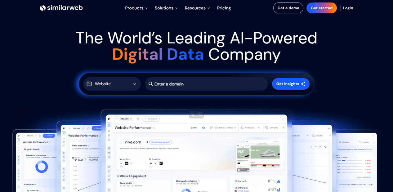 SimilarWeb 是一款专业的网站流量与竞争情报分析平台,覆盖全球超过2亿个网站和移动应用。它允许您按域名、行业分类和国家区域进行深度调研。该工具可展示网站总访问量、流量来源分布、用户参与度、关键词排名及竞争对手表现等核心数据。