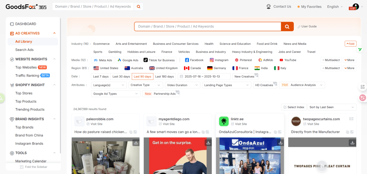 GoodsFox 是一款专注于独立站的广告情报监测平台,覆盖61个国家/地区,追踪 Facebook、TikTok、Google等12大主流广告网络的全球广告数据。它支持按产品品类、广告主域名、投放国家、关键词、投放周期等维度进行筛选与搜索,帮助卖家快速洞察市场趋势与竞争格局。