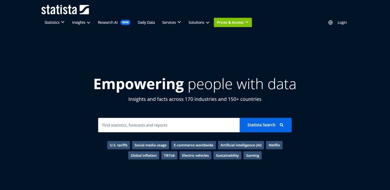 Statista 是一个权威的全球综合数据统计平台,整合了来自知名机构和自家研究的超过80,000个主题的统计数据,覆盖电商、消费品、科技等600个行业和市场。它支持按行业、国家、时间跨度和主题分类进行精确检索。该工具提供详尽的市场研究报告、消费者调查数据、行业前景预测和经济指标等专业洞察。
