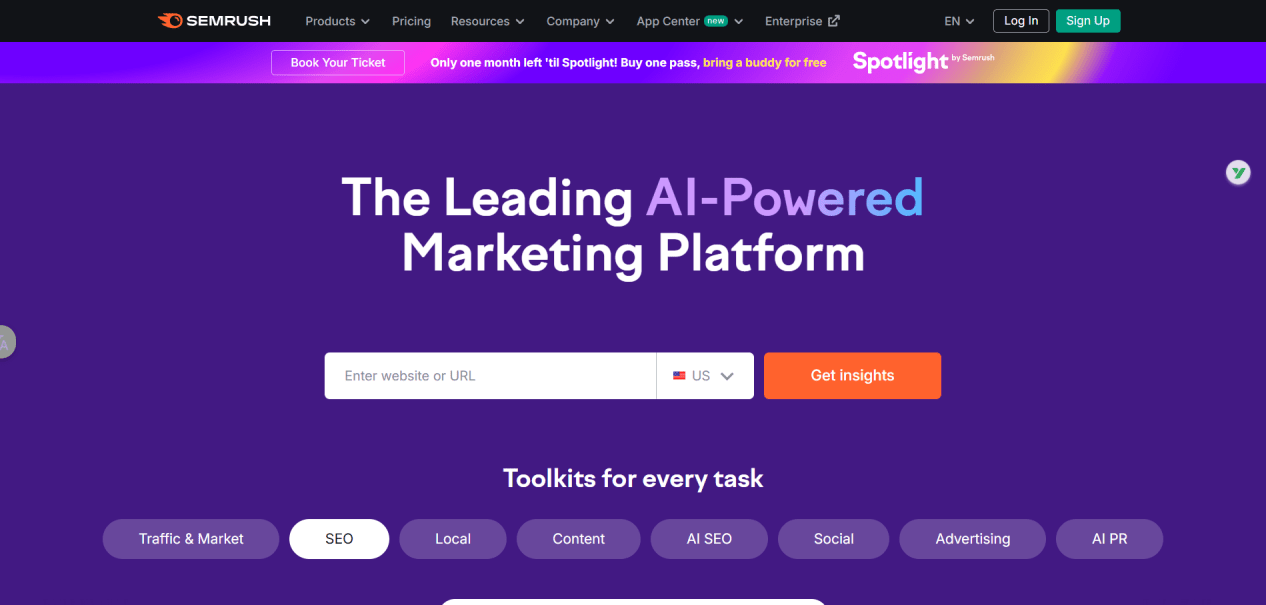 SEMrush 是一个全方位的数字营销分析平台,涵盖搜索引擎优化、广告投放、内容营销和竞争分析等多个领域。它支持按关键词、域名或特定行业进行跨渠道数据挖掘。该工具能提供关键词难度分析、广告文案研究、反向链接追踪和完整的竞争对手数字策略洞察。