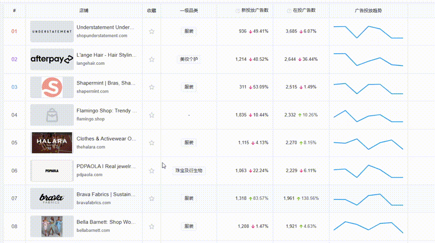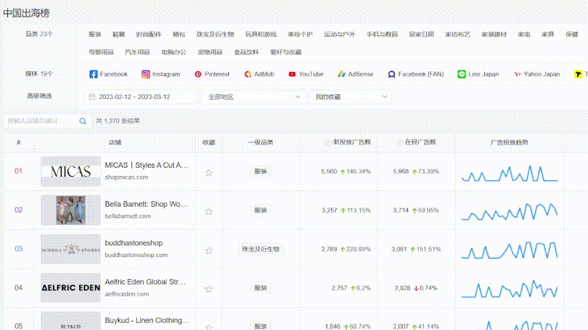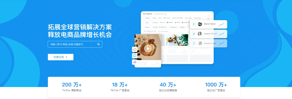 支持查看全球60万+DTC品牌店铺推广数据,发现头部品牌营销投放特点、流量变化及社媒布局等情报。此外,还有提供独家的中国品牌出海榜,一键获取最新出海品牌情报,发现出海新营销玩法及趋势,学习出海品牌成功案例。